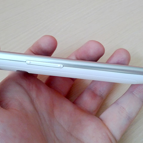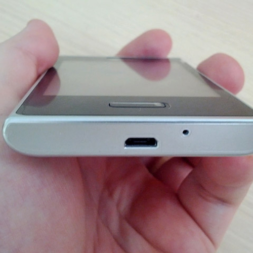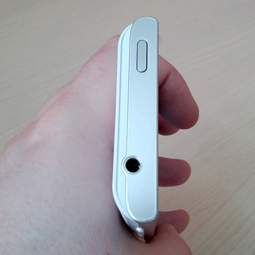 На верхнем торце находится кнопка включения аппарата с разъёмом для наушников 3,5 мм. Нижний торец занят незащищённым разъёмом MicroUSB и разговорным динамиком. На левой грани размещена одна качелька для регулирования громкости, а правая - полностью свободна.