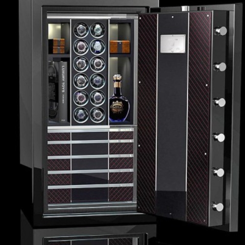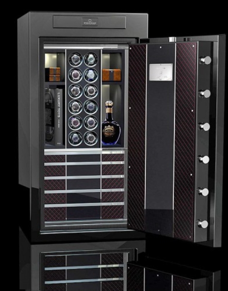 Немецкая компания Dottling создала сейф-шкаф Grand Circle. Основной элемент девайса — это механические часы с маятником, изготовленные вручную. В этом сейфе можно найти отделения для хранения ювелирных украшений, мини-бар, специальный ящик для сигар. Тайник укомплектован самым маленьким низкочастотным динамиком в мире. Акустическая система скрыта, а управлять ей можно дистанционно. Стоит такой сейф $245 тыс.