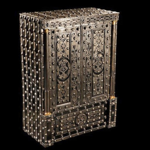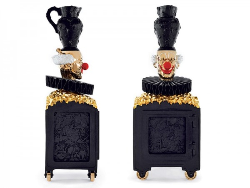Дизайнеры компании Studio Job создали оригинальную коллекцию позолоченной мебели Robber Baron Collection. Одним из элементов коллекции является оригинальный сейф, изготовленный в форме, которая напоминает знаменитую игрушку “Чертик из табакерки“. Наверху сейфа прикреплена золотая голова клоуна.