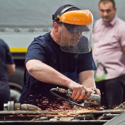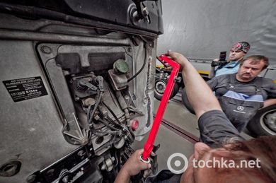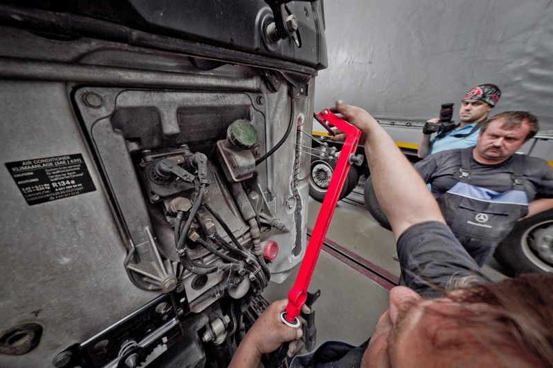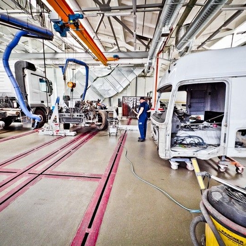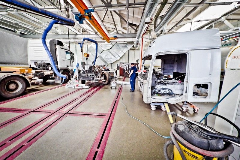 А для ремонта поврежденных кабин коммерческой техники используется специальный стенд, оснащенный подвижным направляющим, а основание кабин (имеющее силовую структуру как в легковом авто) выравнивается с помощью гидравлического цилиндра.