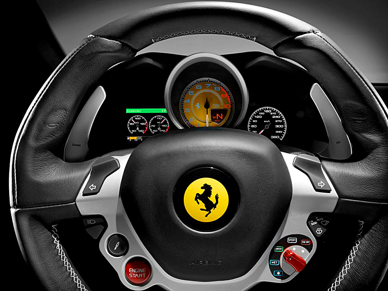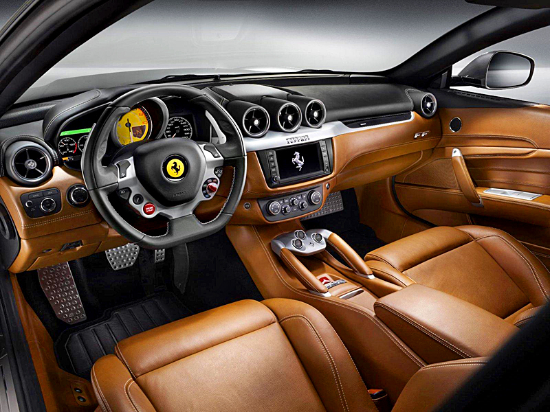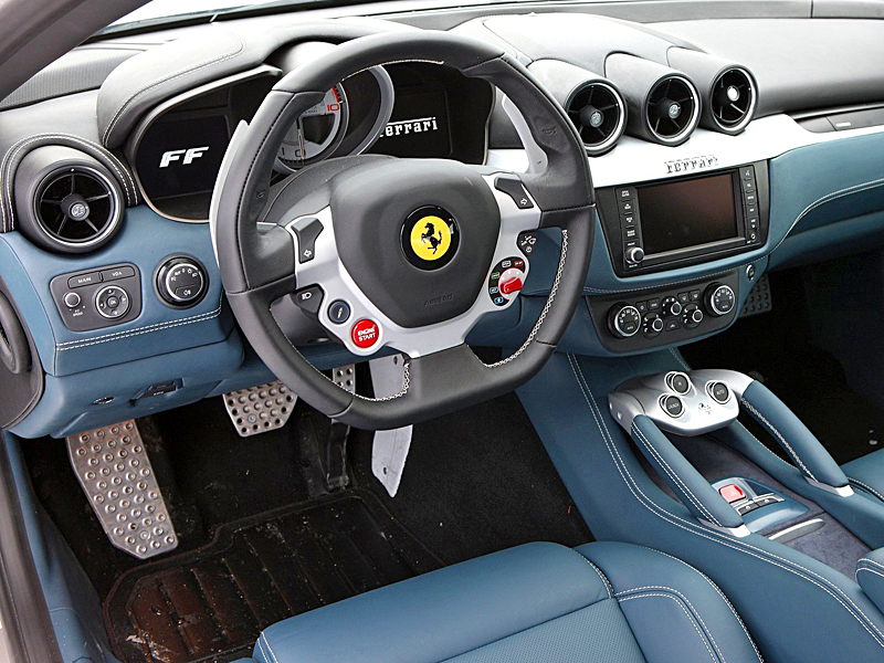 В салоне Ferrari FF принадлежность к легендарной марке узнается без проблем. Центральное место на приборной панели отведено огромному колодцу тахометра, по бокам от которого расположились мониторы, на которые выводятся картинка аналогового спидометра, расчерченного от 0 до 360 км/ч, а также показания бортового компьютера, включая данные о работе виртуальных вспомогательных приборов.