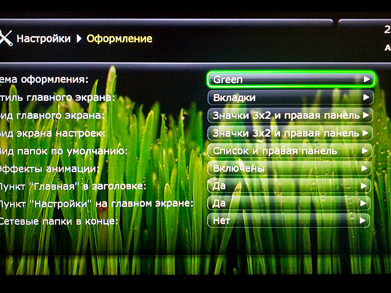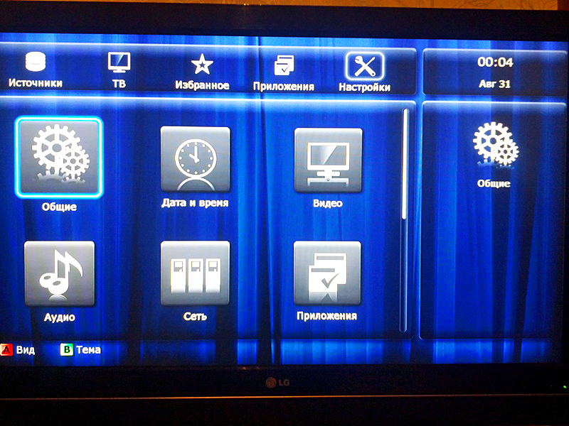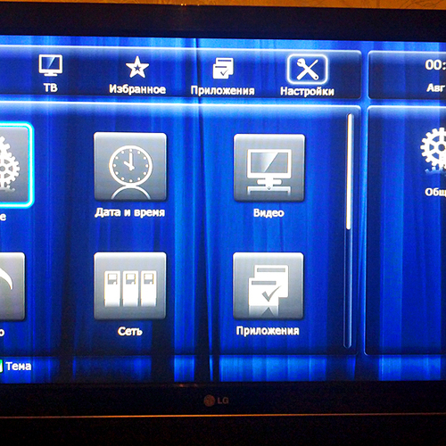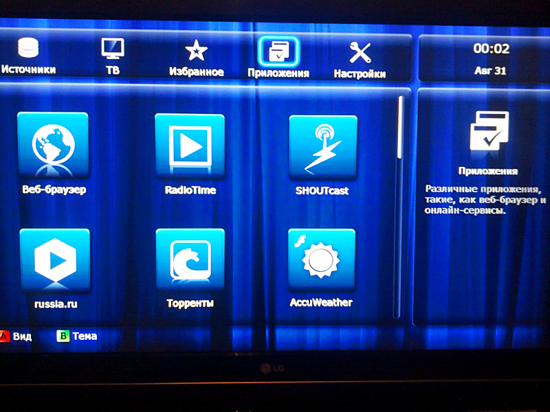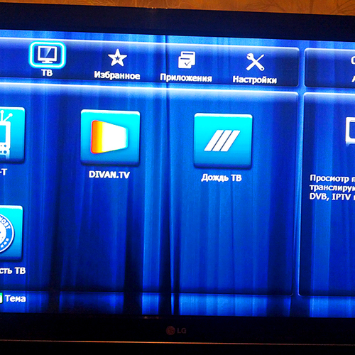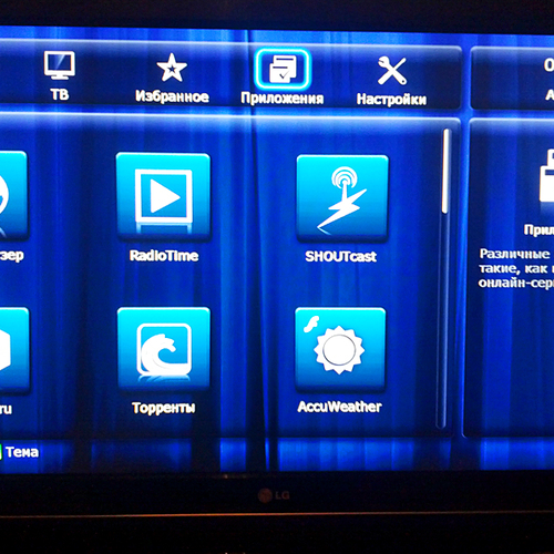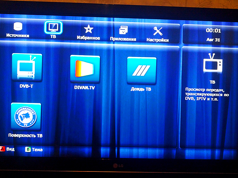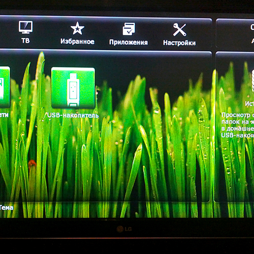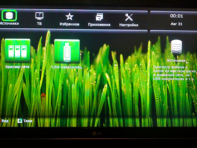 После включения нас приветствует меню, которое хоть и выглядит простовато, но достаточно функциональное, состоящее из пяти основных пунктов: Источники, ТВ, Избранное, Приложения и Настройки. Желательно сразу обновить прошивку на самую свежую, о чем система сама вас уведомит. После обновления прошивки станет доступно больше приложений.
