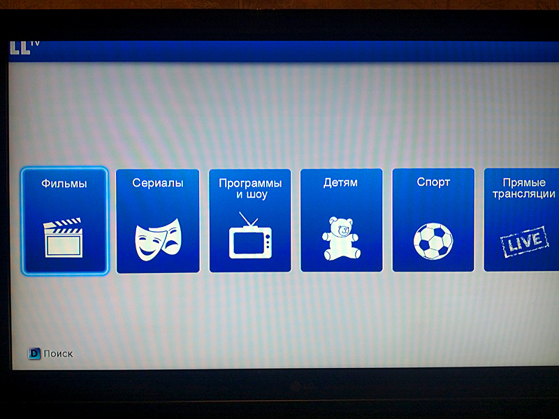 В "Источниках" пользователь может выбрать просмотр контента с флешки (USB-жесткого диска) или через локальную сеть (SMB или UPnP). "ТВ" представляет собой возможность просмотра передач, транслирующихся по DVB или IPTV, доступны: DIVAN.TV, Дождь ТВ и Поверхность ТВ. В "Избранном" хранятся все ваши ярлыки на приложения и каналы.