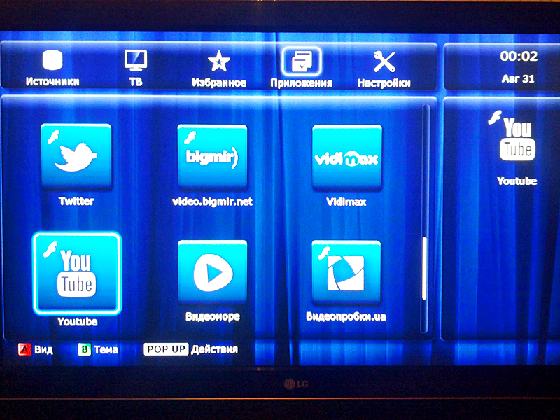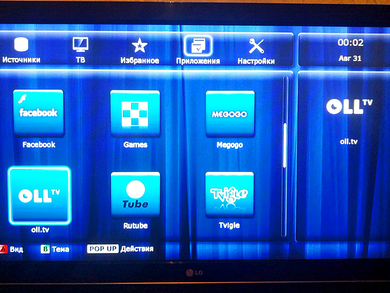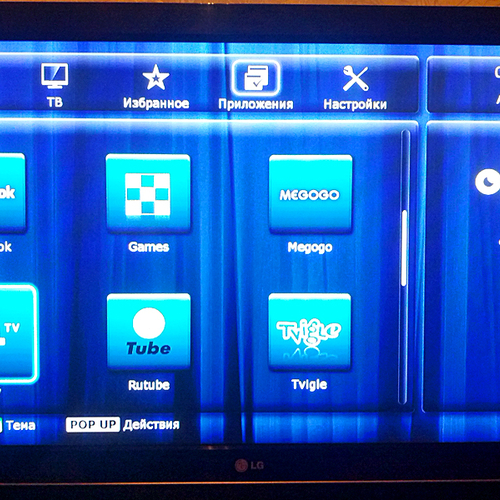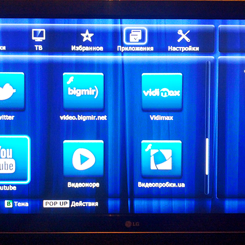 В "Приложениях" есть масса различных программ, которые предоставляют медиаконтент: Megogo, Oll.tv, Tvigle, Vidimax, Rutube, Video.bigmir.net и, конечно, youtube. Суть проста - выбираем любое из представленных приложений, находим любимый фильм, нажимаем PLAY и наслаждаемся просмотром. Не нужны никакие флешки или компакт-диски, все транслируется напрямую из интернета. Есть даже возможность просмотра ленты Facebook и Twitter.
