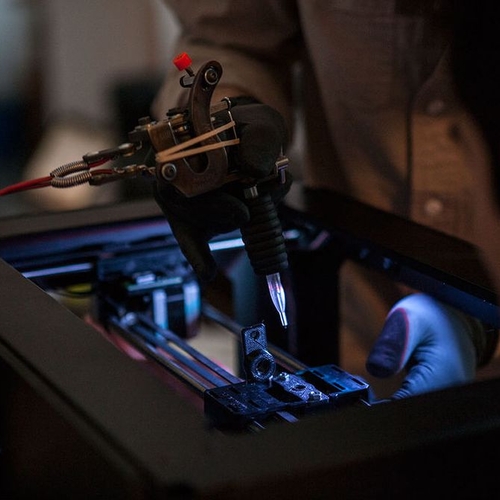 Теперь 3-D принтер MakerBot Replicator может не только печатать из пластика, но и наносить рисунки на кожу человека. На первых парах для этого решили использовать только шариковую ручку, а вот для нанесения настоящих тату понадобится также самодельная тату-машинка и фиксатор кожи человека.