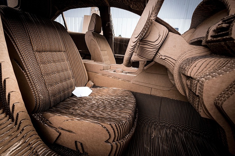 Всего на постройку машинки пошло 1700 тысяч листов картона. Каждый из них вырезался специальной лазерной установкой (спасибо Lasercut Works). А потом всю эту макулатуру склеивали особенным влагостойким сверхмощным клеем, который сох по 10 минут на каждом стыке.