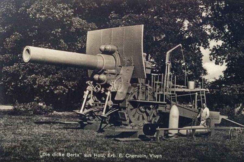 Немецкая 420-мм мортира. Предназначалась для разрушения особо прочных фортификационных сооружений. Скорострельность «Берты» составляла 1 выстрел в 8 минут, а дальность полета 900-кг снаряда 14 км. Все три типа используемых снарядов обладали для того времени огромной разрушительной силой.