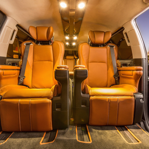 При работе над интерьером создатели проекта черпали вдохновение в оформлении салонов частных самолетов и яхт. Внутри — 6 отдельно стоящих кресел (+ трехместный диван четвертого ряда), способных передвигаться вперед и назад. Еще есть отделка кожей и деревом, плюс соответствующая размаху проекта мультимедийная система.