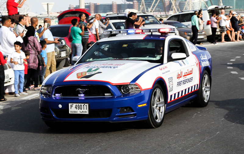 И еще одна гордость медицинских служб Дубая — Мустанги 2014-го года производства. Правда, эти в основном катаются по выставкам. Хотя, иногда таки приезжают и на неотложку.