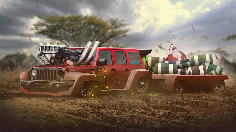 На этом Санта без проблем сможет гонять по пустыням. Не последнюю роль в этом играет дрэговый V8. А еще есть большой прицеп — подарки же нужно в чем-то возить.