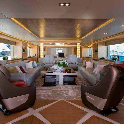 - салон открытой планировки с четырьмя большими креслами и двумя диванами, окружающими мраморный журнальный столик (на главной палубе).