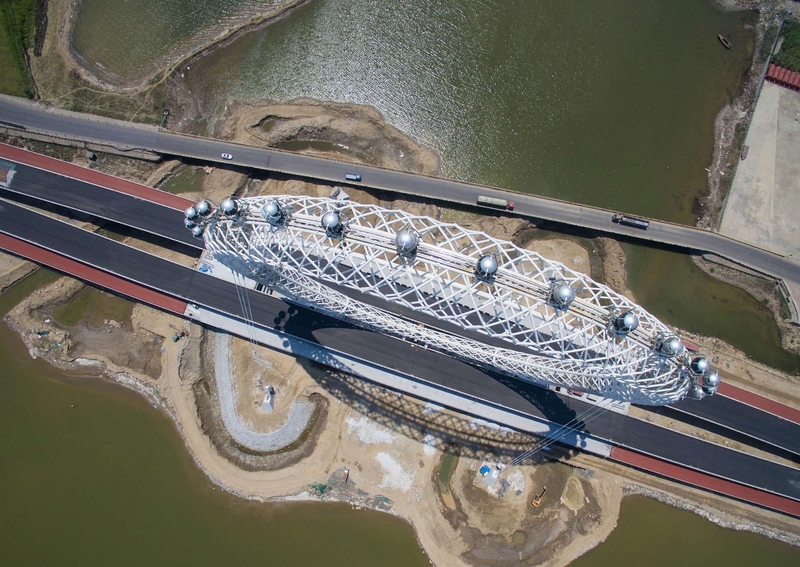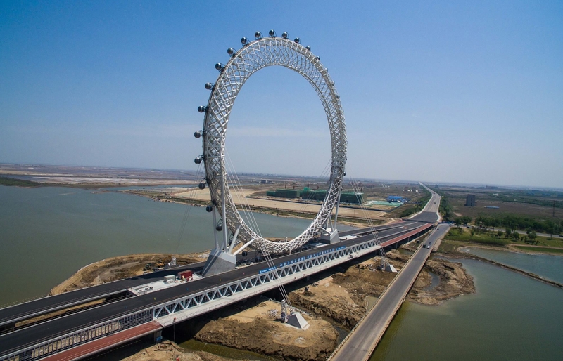 В центральной части китайской провинции Шаньдун создано одно из самых необычных колес обозрения. Его фишка — ни одной спицы