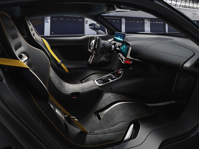 Интерьер гиперкара — в стиле минимализма: ни грамма лишнего. Материалы отделки: углеволокно, кожа, алькантара, алюминий. Рулевое колесо напоминает руль Формулы-1: прямоугольное, с кучей кнопочек / управлением режимами движения и настройками подвески.