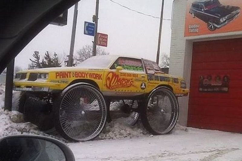 Это тюнинг-ателье из Огайо. Как-то ребятам в голову пришла идея порекламировать себя. Идея хороша, но в голову пришло “такое“. А именно: инженеры смастерили гигантские 50-дюймовые колесные диски с шинами собственной разработки. Поставили все это на Oldsmobile Cutlass 4-го поколения.
