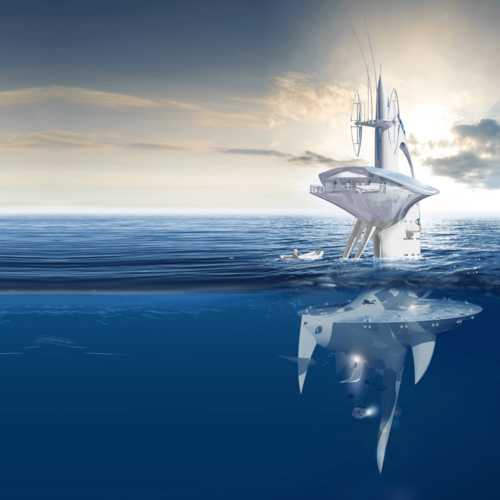 Футуристическое вертикальное морское судно, разработанное французским архитектором Жаком Ружери. Разработано для долгосрочных исследований и наблюдения. Такая себе подводная станция, имеющая несколько уровней подводных кают и широкую “юбку“, в которой могут ютиться дайверы.