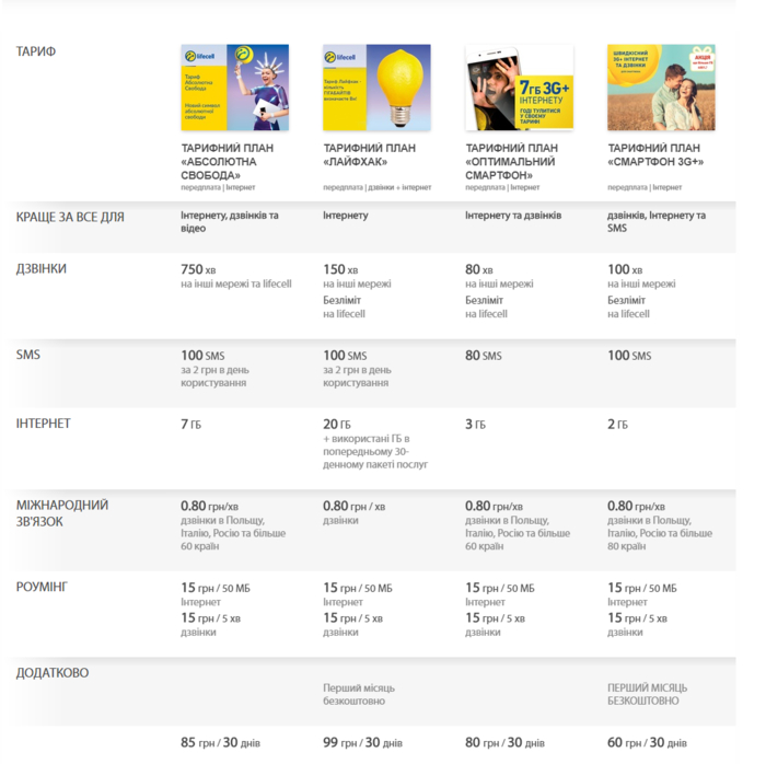 Cамый бюджетный тарифный план “Звонки всем 2017“ предусматривает звонки внутри сети и 75 минут на другие номера. За 100 смс в день нужно будет заплатить 2 гривны. На Интернет выделяеться лишь 250 МБ на 5 дней за 10 гривен. Первый месяц использования тарифного плана - бесплатный. В дальнейшем платить придеться 50 гривен в месяц. К сожалению, компания не предлагает безлимитный Интернет. Максимум вы сможете преобрести 20 ГБ высокоскоростного подключения за 99 грн.