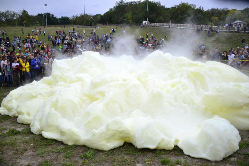 Самый масштабный в Украине эксперимент по разложению перекиси водорода. Студенты кафедры органической химии ДНУ им. Олеся Гончара под руководством преподавателя продемонстрировали гостям техфеста необычайное зрелище, создав из смеси перекиси водорода, моющего и раствора катализатора 10 000 литров горячей пены. Это было похоже на извержение небольшого вулкана. Эксперимент проводился дважды — в субботу и воскресенье, каждый раз собирая огромное количество зрителей.
