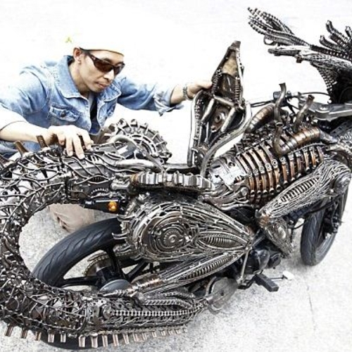 Креатив дороже денег: владелец нескольких автомастерских в Таиланде оказался человеком с диким художественным вкусом. Его «мусорный» байк представляет собой невиданную бестию в прыжке. Судя по агрессивному виду, это – кузнечик-убийца с Венеры.