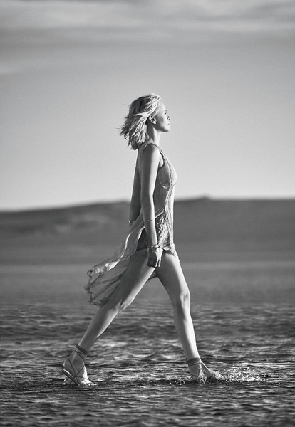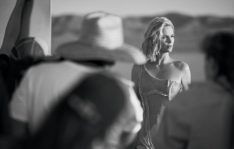 Американскую красотку нарядили в шикарное золотистое платье, и поставили на колени в воду. А потом еще и приказали изображать эротику. Не ведаем, сколько барышне за это пообещали деньжат. Но Шарлиз долго не сопротивлялась, и работу свою выполнила весьма качественно. Смотри: