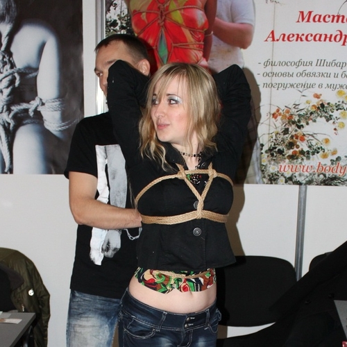 Лавируя бесконечной чередой стендов с вибраторами невообразимых конструкций, красотками из латекса всех сортов, цветов и рас, вереницами плеток, хлыстов и наручников, M PORT наткнулся на довольно интересную экспозицию – Искусство эстетичного связывания Шибари.