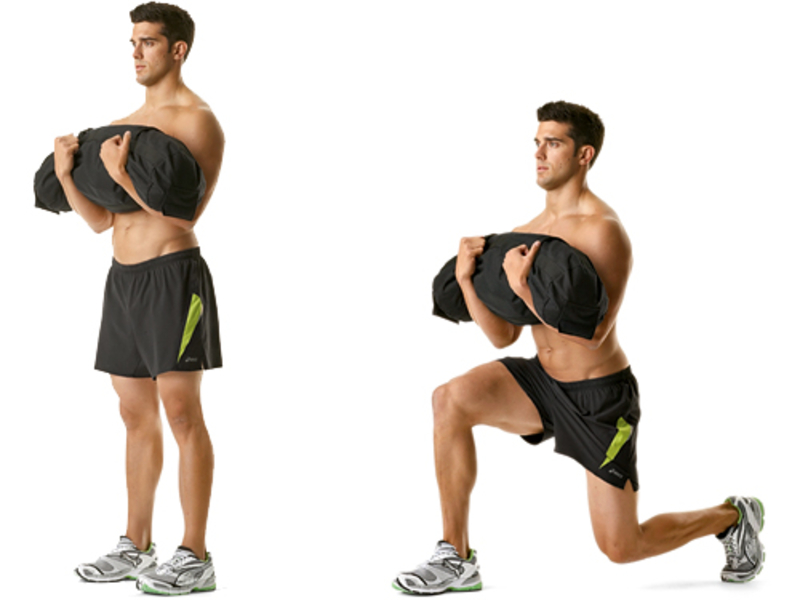 Правой ногой сделать шаг вперед, затем медленно опустить тело, сгибая правую ногу в колене. Опуститься в положение, когда правая нога будет согнута на 90 градусов. На несколько секунд замереть в данном положении, затем быстро, почти рывком подняться в исходное положение. Поменять ногу, повторить то же движение. Сделать упражнение 20 раз. Оптимально выполнить 3 сета с 30-секундными интервалами между ними.
