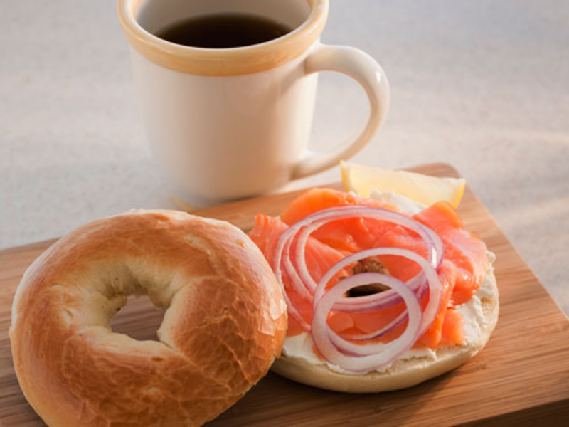 Собери комплект из рогалика (или снека), нежирного сыра и копченного лосося. Для вкуса можешь добавить лук, или оросить это дело лимонной кислотой. В сумме - 20 граммов протеина.