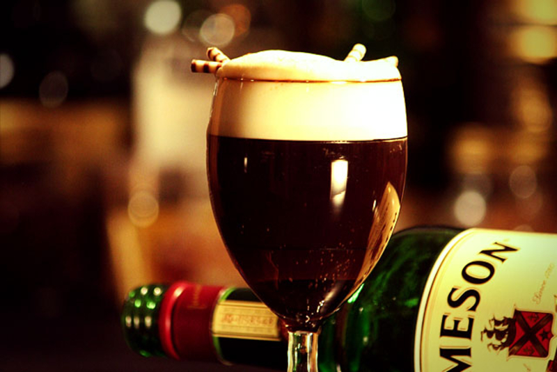 Налей в миску сливки, и взбивай венчиком примерно минуту. Добавь ирландский виски, горячий кофе и сахарный сироп. Размешай коктейльной ложкой, и с ее помощью уложи слой взбитых сливок доверху.
