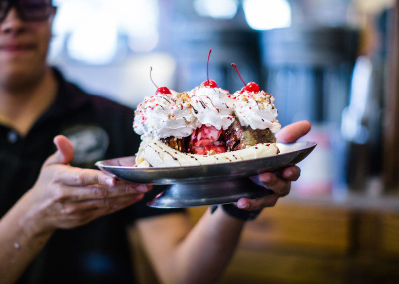 За 30 минут нужно разделаться с The Kitchen Sink. Это 8 порций гигантского мороженого, в составе которого есть бананы, пирожные, печенье, горячая помадка и карамель. Также нужно выпить два стакана воды. Приз: не придется платить за этот десерт ($40) + футболка и твой портрет на стене заведения Fair Oaks Pharmacy.