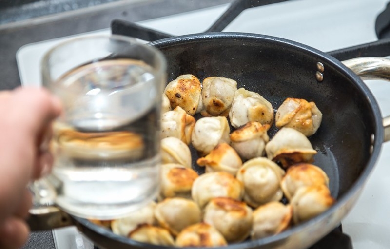 Как только поймешь, что все детали блюда более-менее равномерно обжарились со всех сторон до золотистой приятной корочки, бери стакан кипятка и выливай его в сковородку. Вода должна покрыть твоих друзей из теста до половины. Сразу все зашипит, забурлит, и начнет брызгаться. Не теряйся, и резко-четко накрывай сковородку крышкой. Жди, пока там все не успокоится.