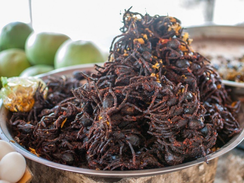В Камбодже эти огромные, волосатые и неуклюжие пауки считаются деликатесами. Продаются едва ли не на каждом углу страны, подаются с чесноком и солью, хрустящие снаружи и тягучие внутри.
