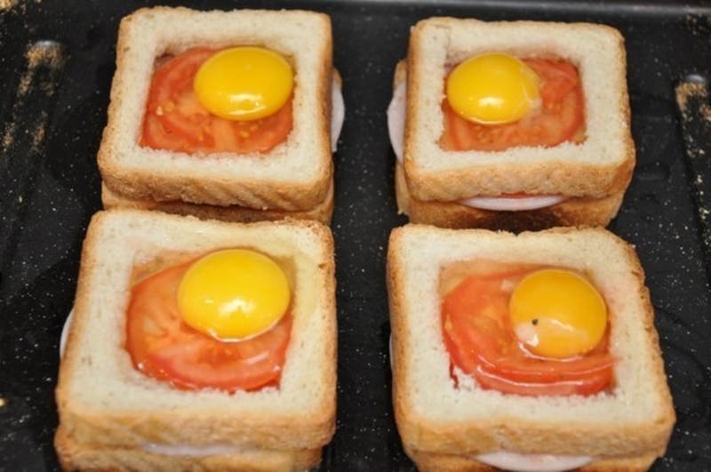 3. На остальные 4 кусочка хлеба положить по 2 пластинки ветчины, на них – оставшиеся 4 хлебных “ободка“ без мякиша. Внутрь ободков положить нарезанные кружочки помидоров и разбить в каждый бутерброд по яйцу. Посолить, поперчить.