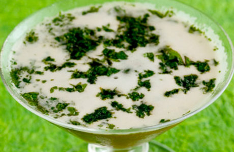 Положить в сироп листья мяты, перемешать. Залить в шейкер. Трясти до появления пены. Тонкой струйкой налить в охлажденный бокал для мартини. Сверху посыпать измельченной мятой.