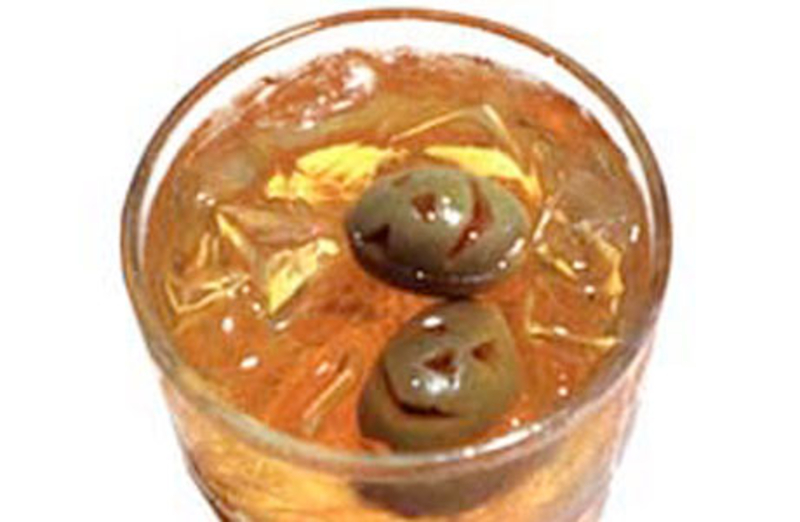 Вырезать в оливках маленькие маски Хэллоуина. В шейкере смешать оливки и имбирный эль со льдом. Потрясти. Наливать в стаканы хайбол. Добавить еще эля. Украсить гарниром из оливок.