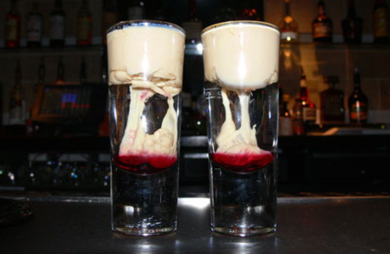 Налить ликер в высокий стакан. Сверху осторожно добавить ликер Bailey’s. Затем по капле добавлять гренадин. Должно получиться довольно пугающе!