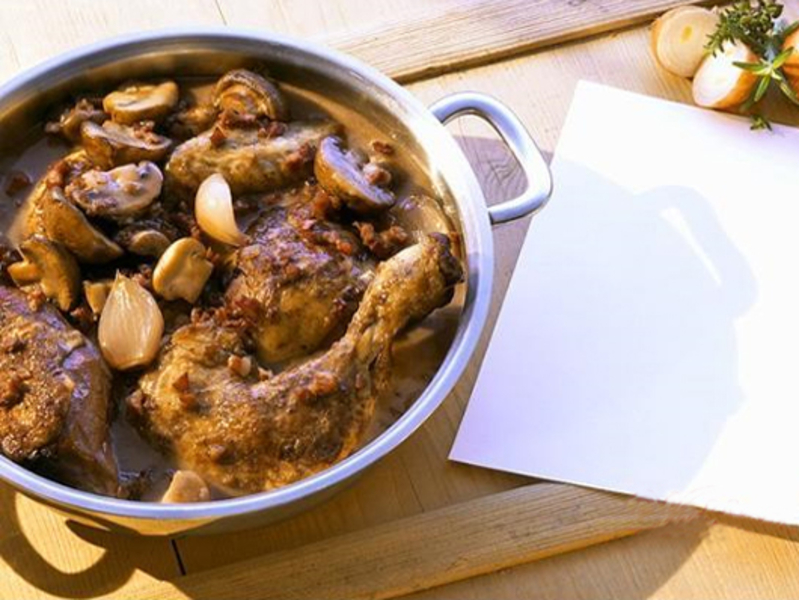 1. ЦЫПЛЕНОК ПО-ОХОТНИЧЬИ В ВИННО-ГРИБНОЙ ПОДЛИВЕ