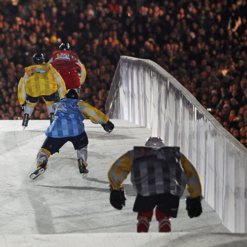 Ice Cross Downhill - скоростной спуск на коньках по ледяному желобу с прохождением поворотов и трамплинов. Еще этот вид спорта называют экстремальный слалом на коньках или ледяные гонки.