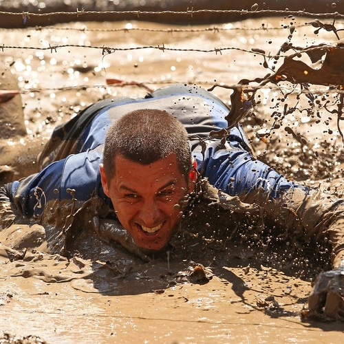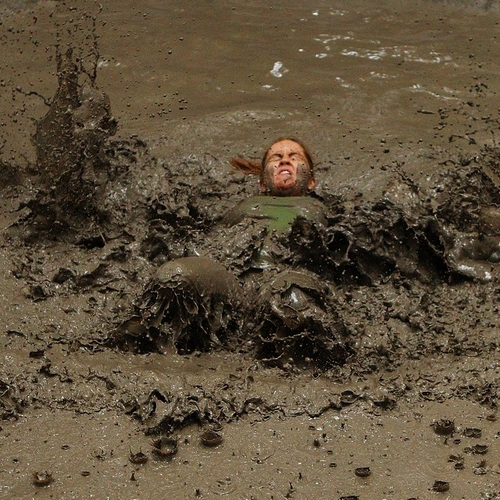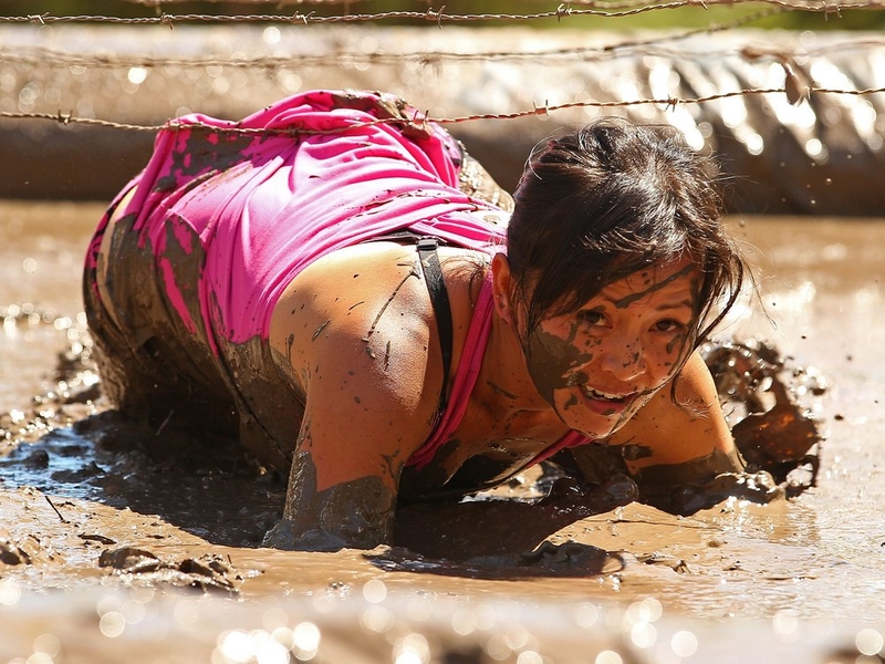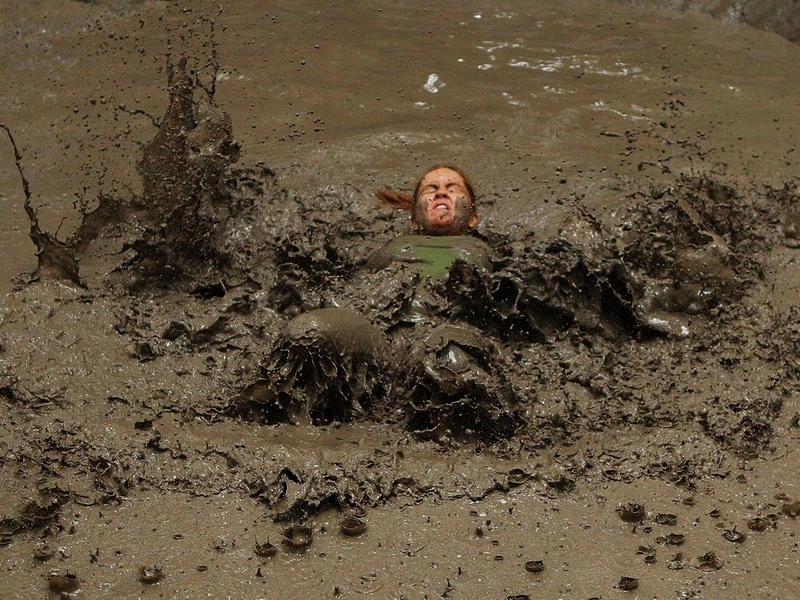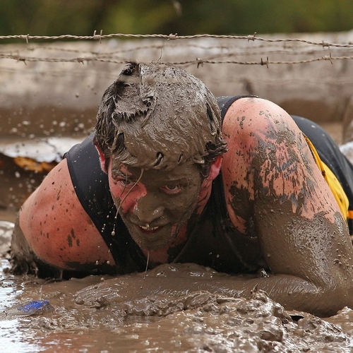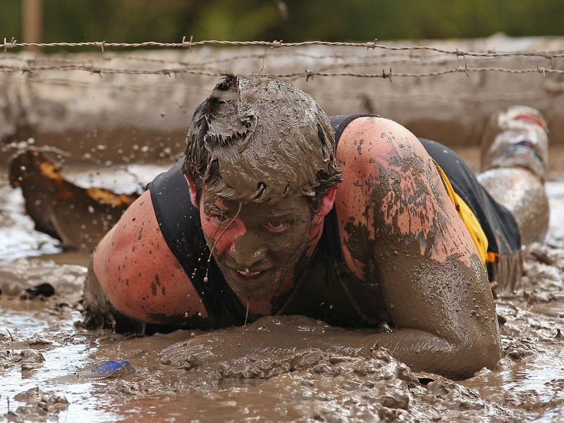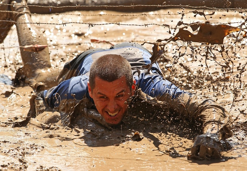 Но самый тяжелый участок трассы - это вязкая и непролазная грязь, в которой надо ползти, умудряясь при этом преодолевать препятствия, одним из которых является низко натянутая проволока, под которой нужно проползти, буквально ныряя в грязь.