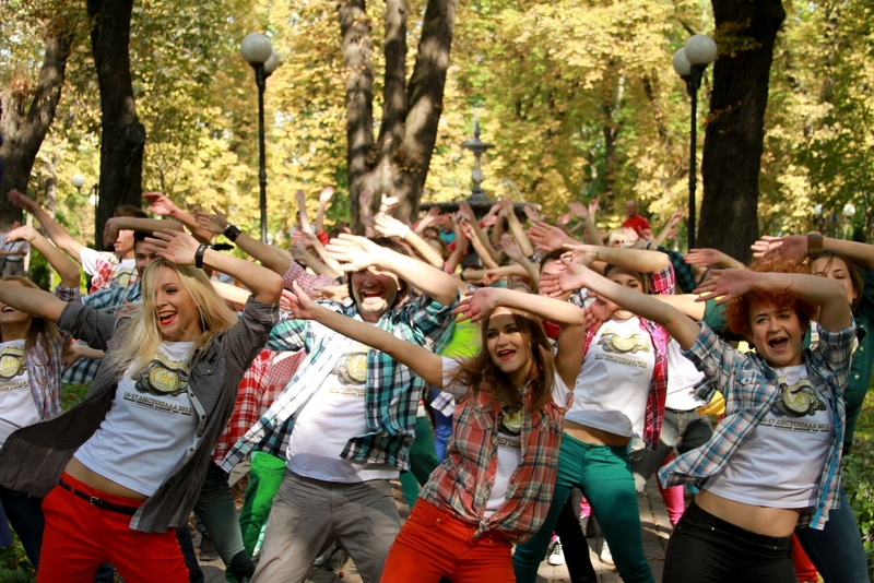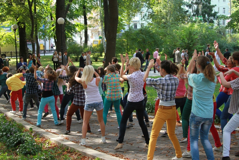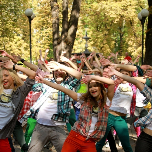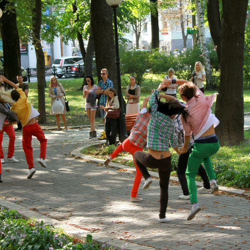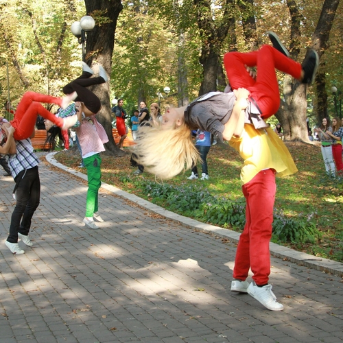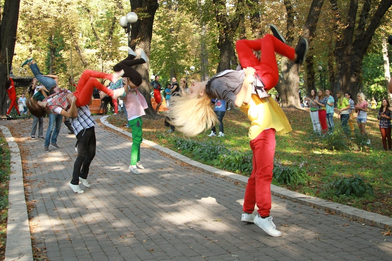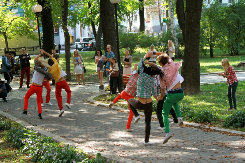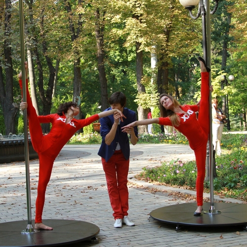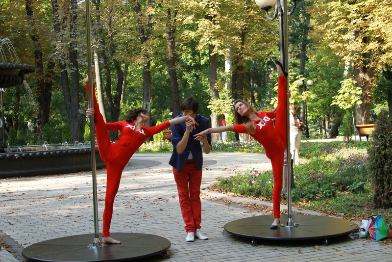 На одной из аллей парка развернулось интересное и захватывающее действо - первый в Украине PoleArt-флешмоб! Главное его отличие от обыденной танцевальной постановки - это участие в нем не только танцоров, но и акробатов, жонглеров, паркурщиков и pole-денсеров.