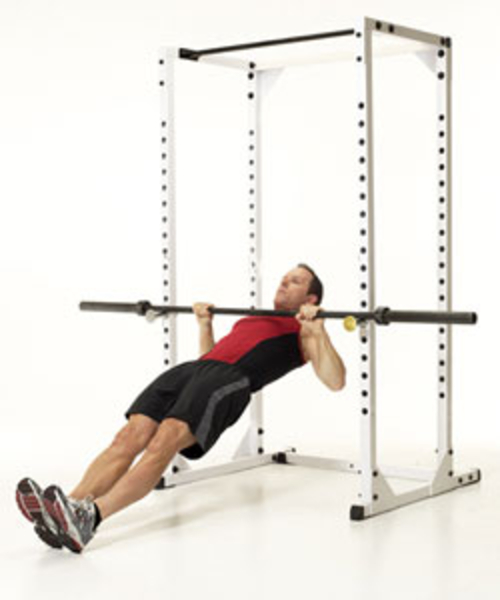 Плавно переходим от груди к прессу. Бросай штангу на держатель, ложись под нее и подтягивайся, пока грудь не будет касаться перекладины. Если слишком высоко - подложи под ноги швейцарский мяч. Важно: не прогибай тело, оно должно быть ровным.
