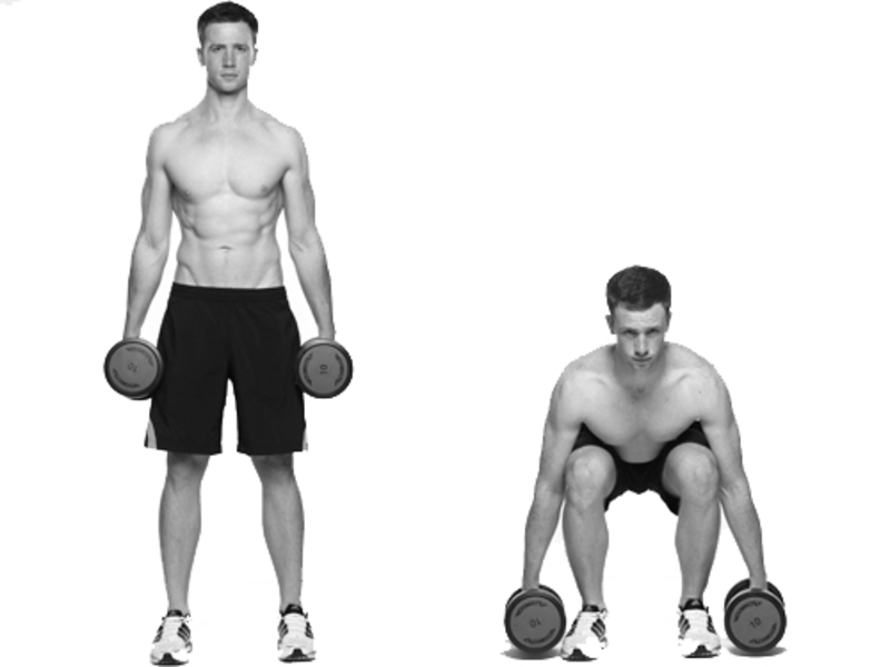 Приседай с гантелями в руках. Важно: опускайся медленно и до тех пор, пока ими не коснешься пола. Или пока бедренные кости не станут параллельны почве. Ли Эшфолд, еще одна звезда тренажерки, утверждает: