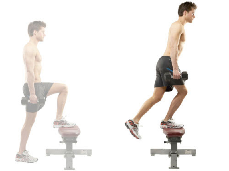 С гантелями в руках поднимайся на любую возвышенность. Персональный тренер Джеймс Уайт утверждает, что так укрепишь подколенные сухожилия, ягодицы и квадрицепсы. Норма - 15 подъемов на каждую ногу. Легко? Возьми гантели потяжелее.