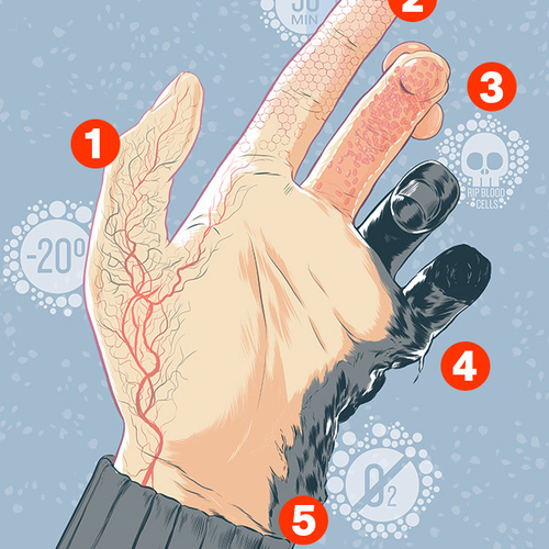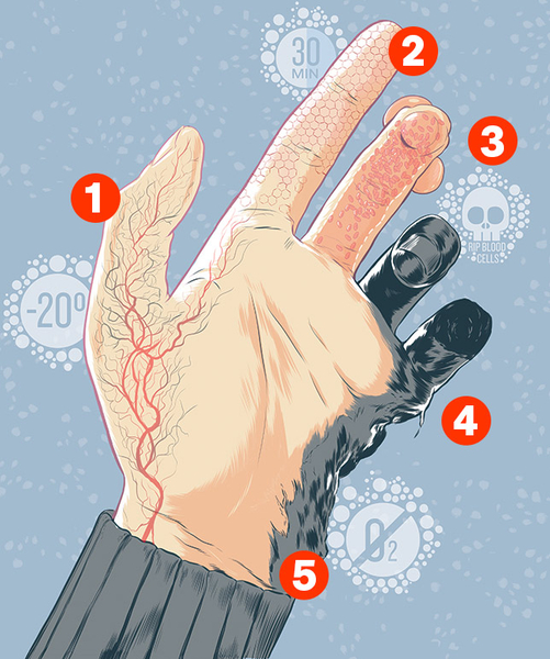 Если ты не заметил странного цвета своей кожи, или проигнорировал непонятные пятна на своих конечностях, тогда готовься к последствиям серьезнее. Например, к формированию кристаллов льда вокруг связок, мышц и костей. Самое страшное - это постепенное замерзание миокарда. Из-за этого падает частота ЧСС, кровь медленнее расходится по организму, и обмороженные клетки вместо кислорода продолжают получать обильные порции холода.