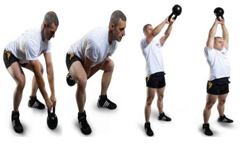 Возьми гирю за ручку. Рывком подними ее к плечу, разворачивая запястье ладонью вперед. Оттолкнись ногами от пола, привставая и выбрасывая снаряд от плеча над головой. Норма — 2 подхода по 5 повторений.