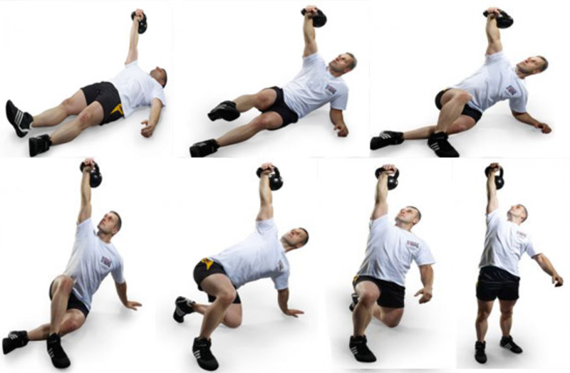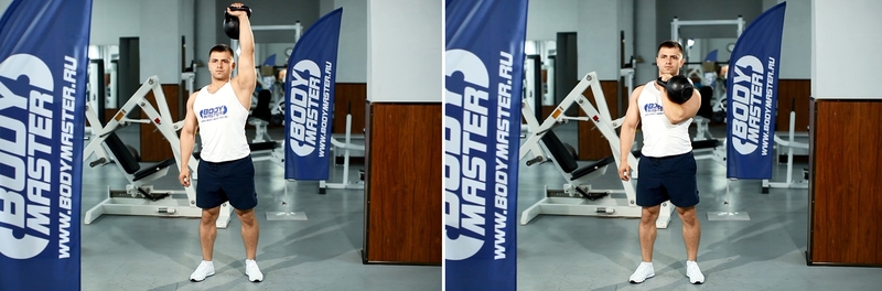 Подними гирю к плечу. Рука согнута в локте, а ладонь обращена к себе. Выжми гирю над головой, одновременно разворачивая запястье ладонью вперед. Затем опусти гирю в исходное положение, разворачивая запястье на прежнее место. Норма — 2 подхода по 5 повторений.