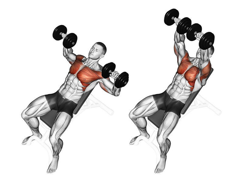 Ложитесь на скамью и возьми в руки гантели. Поднимите их перед грудью на вытянутых руках.- Делая вдох, опустите гантели к плечам и вернитесь в исходное положение.