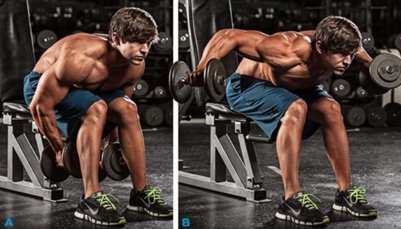 Сядьте на скамью, держа ступни вместе. Прогните спину и немного наклони ее вперед.- Тяните гантели к поясу, чуть сильнее, чем принято, разводя локти в стороны. Старайтесь как можно сильнее сводить лопатки вместе в фазе подъема.