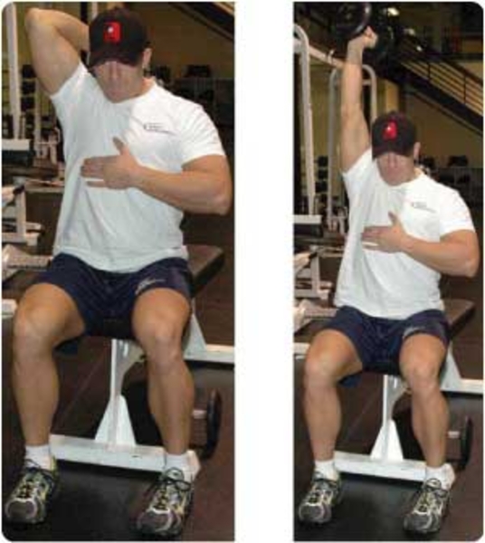 Сидя на стуле, возьми гантель в правую руку. Подними руку вверх над головой – это и есть исходная позиция. Начни медленно опускать гантель, держа руку в локте несгибаемой. Левой рукой можешь придерживать локоть правой – это повысит надежность страховки. Не касаясь гантелью плеча, начни выжимать ее обратно. Затем выполни упражнение для левой руки – оно хорошо развивает трицепсы.