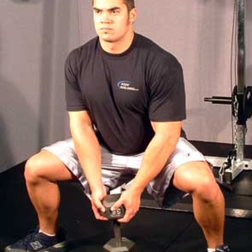 Возьми в руки гантели, ноги на ширине плеч. Держа спину ровно и вертикально, приседай, пока ноги не согнутся в коленях под прямым углом. На миг задержись в этом положении и поднимайся, пока ноги не выровняются. Тренируются квадрицепсы и ягодицы. К слову, приседать можно и с одной гантелью.