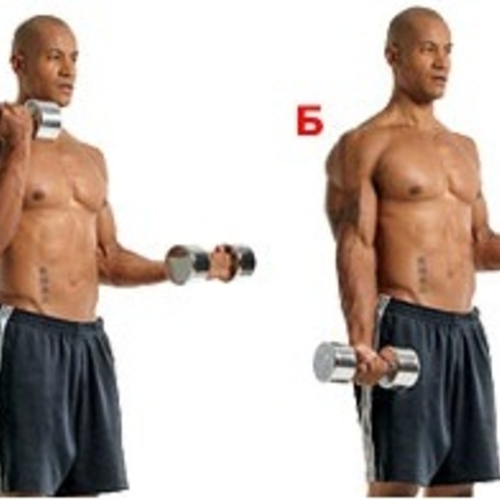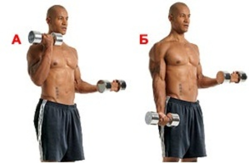 В позиции сидя или стоя удерживай гантели ладонями, обращенными к бедрам. Сделав вдох, медленно начинай сгибать правую руку, подспудно разворачивая ладонь с гантелью вверх. В верхней точке сделай окончательный выдох, и начни опускать правую руку, одновременно сгибая левую. Упражнение отлично формирует бицепс.
