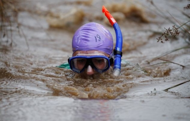 Но не это, наверное, больше всего привлекает зрителей. 110 участников, приехавших из разных стран мира и вооруженных маской, трубкой и ластами, должны как можно быстрее преодолеть 55-метровую водную дистанцию в торфяном болоте Waen Rhydd Bog.